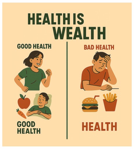 MKVS Music & Multimedia Arts Academy In CoimbatoreHealth Is Wealth – Good Health Vs. Bad Health & HabitsThe Proverb "Health Is Wealth" Emphasizes That Good Health Is More Valuable Than Any Amount Of Money. A Person With Good Health Can Lead A Happy, Energetic, And Productive Life, While Poor Health Limits One's Potential And Brings Discomfort, Disease, And Emotional Stress. Good Health Is A Result Of Healthy Habits Such As Regular Exercise, Balanced Nutrition, Proper Sleep, Hydration, And Mental Well-Being. People Who Eat Fruits And Vegetables, Stay Active, Avoid Junk Food, And Manage Stress Through Meditation Or Hobbies Often Enjoy Stronger